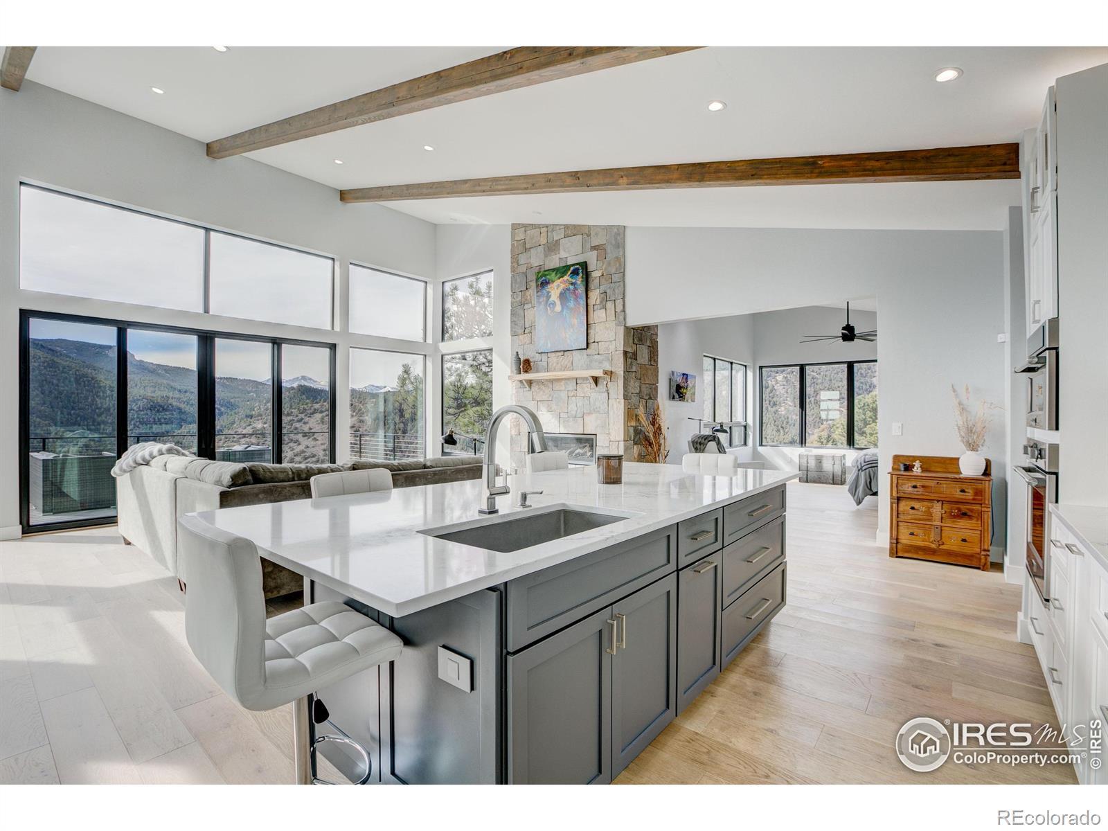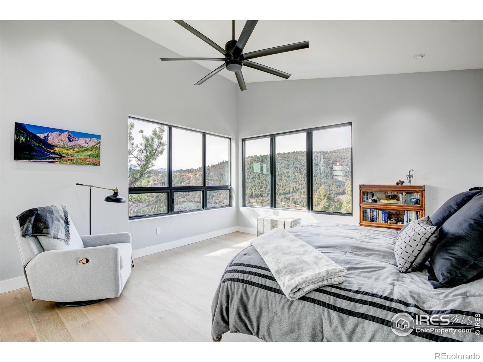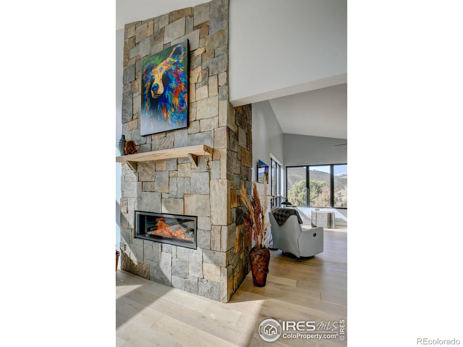Modern Mountain Masterpiece 1068 Elkridge Drive. Perched on a private 6-acre lot in Glen Haven, this exceptional contemporary retreat offers a rare blend of luxury, sustainability, and breathtaking natural beauty. Designed to frame panoramic views of Longs Peak and Rocky Mountain National Park, this architectural gem is a true sanctuary in the mountains. Step inside to a light-filled open floor plan featuring soaring 16-foot ceilings with rustic wood beams and elegant White Oak hardwood floors. Expansive south-facing windows maximize passive solar efficiency, providing natural warmth in winter and cool comfort in summer. Floor-to-ceiling Pella windows showcase 360 sweeping views of rugged rock outcroppings, ancient pines, and surrounding peaks. Outdoor living is equally impressive with a spacious front deck, private rear patio with spa, and a balcony off the guest suite-perfect for relaxation and entertaining. The chef's kitchen offers luxury cabinetry, quartz countertops, premium appliances, and a large butler's pantry. The primary suite includes a generous walk-in closet with custom built-ins, while spa-inspired bathrooms feature custom tile and high-end fixtures. A dedicated laundry room with built-in workspace and energy-efficient LED lighting enhance everyday living. Superior mechanical systems include a 5-zone radiant heating system and tankless water heater. The impressive 4-car heated garage features an RV-height door, workshop space, and abundant attic storage. Additional highlights include a paved parking pad, advanced water treatment system, exterior stucco finish and low-maintenance natural landscaping. Located minutes from Roosevelt National Forest and Rocky Mountain National Park trailheads, this remarkable property offers unmatched access to Colorado's wilderness while delivering modern luxury and comfort. Situated in the quiet community of Glen Haven Colorado, 15 minutes from Estes Park and Rocky Mountain National Park