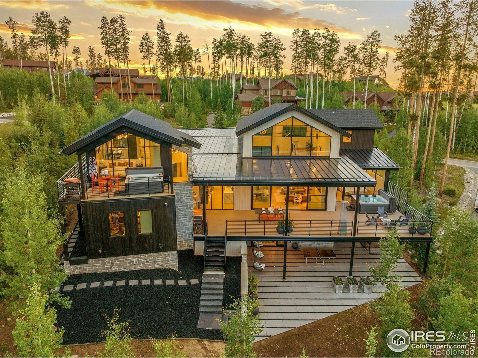 This exclusive mountain modern home in the prestigious Leland Creek neighborhood of Winter Park is truly one of a kind in Grand County. Built in 2023 by Never Summer Construction & designed by Munn Design, this 5-bed, 5-bath residence spans over 4,574 sq ft & offers breathtaking views of the Continental Divide. Super close to 2 bil expansion at Winter Park Resort, it's the perfect year-round retreat, blending sleek contemporary design w/ warm rustic charm. Inside, the home is thoughtfully appointed w/ Room & Board furnishings (negotiable), designer lighting, a Sonos sound system & a cozy gas fireplace. The gourmet kitchen is a chef's dream, featuring a 48" gas range, built-in fridge/freezer, hidden 100-spice rack, appliance garage & two pantries-one lockable for rentals. The open-concept layout is ideal for entertaining & everyday living. Step outside to enjoy 2,548 sq ft of outdoor living space, including a wraparound deck w/ a wood-fired pizza oven, BBQ, commercial-grade heaters & a 10-person hot tub. Massive 20-ft glass sliding doors seamlessly connect indoor & outdoor areas, creating a true mountain oasis. The private master suite offers a freestanding tub w/ a hidden view window, dual closets (one lockable) & direct hot tub access. Additional guest accommodations include an upper-level king suite, a bunk room w/ two Room & Board bunk beds (space for a third), & a lower-level king bedroom w/ easy access to a full bath. Entertainment & workspaces abound w/ a game room, home gym w/ custom glass doors & a bright office featuring floor-to-ceiling windows. Comcast available for high-speed connectivity. A separate studio apartment, styled as a mini version of the main home, earned $68K in 2024 & includes its own hot tub & mountain views. Located just 5 minutes from Winter Park Resort & close to Hideaway Park, Grand Park Rec Center & The Foundry, this home offers unmatched access to skiing, hiking & year-round adventure.