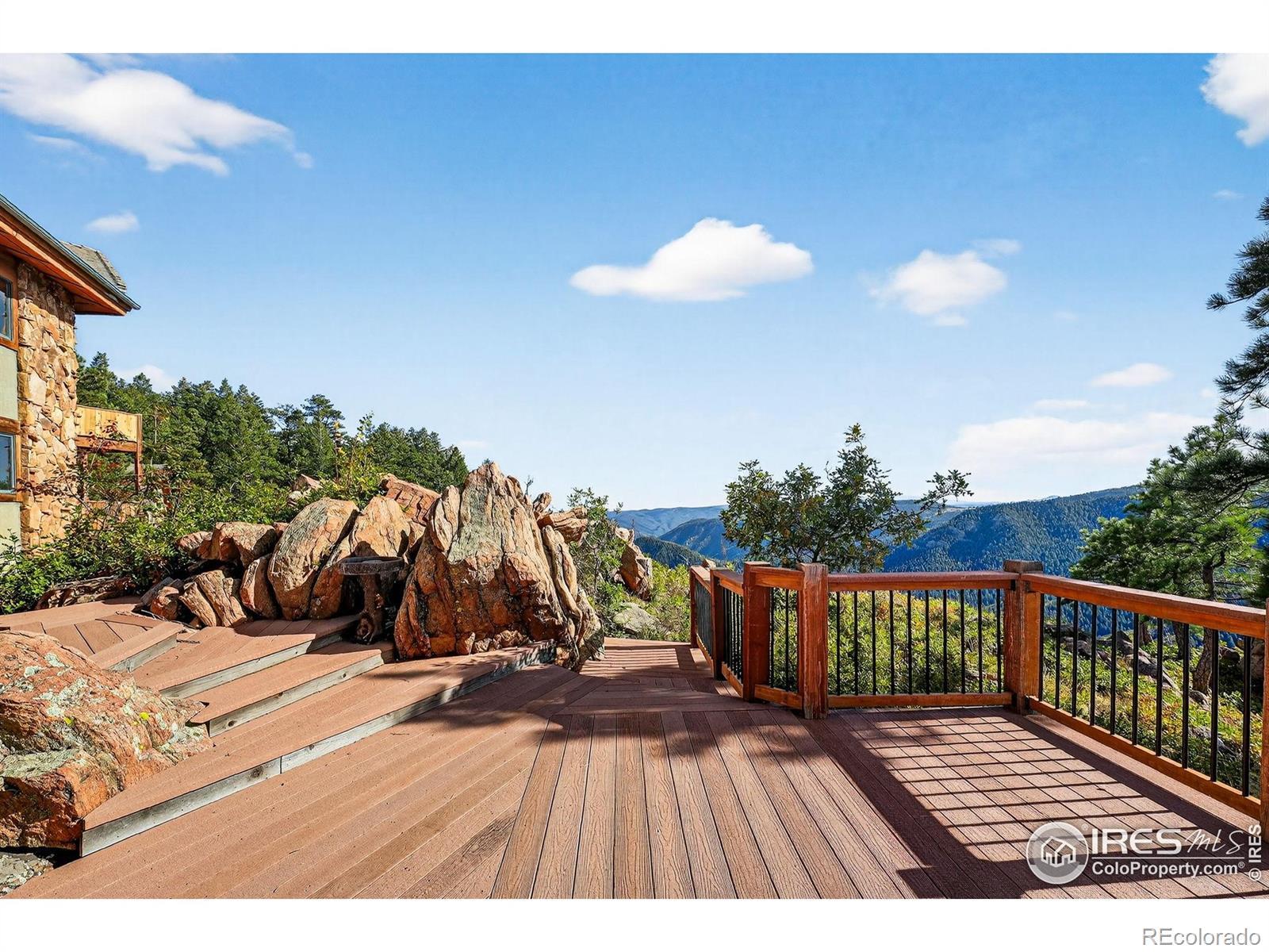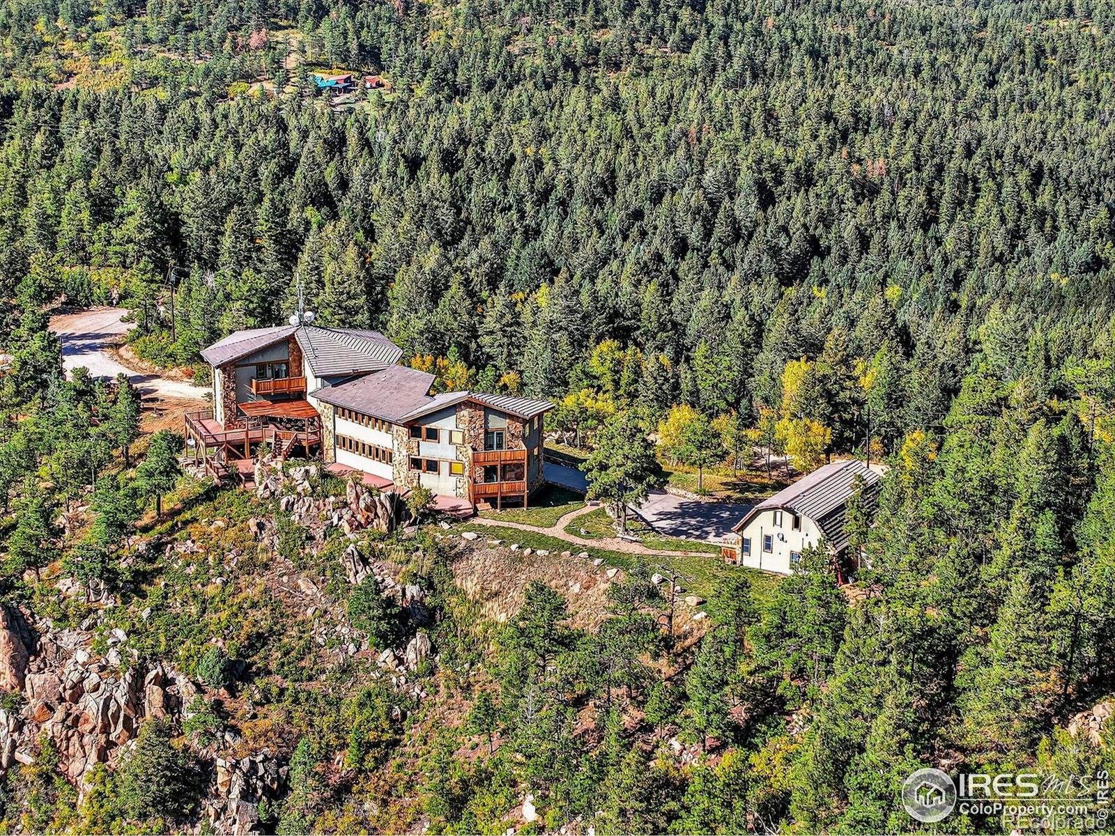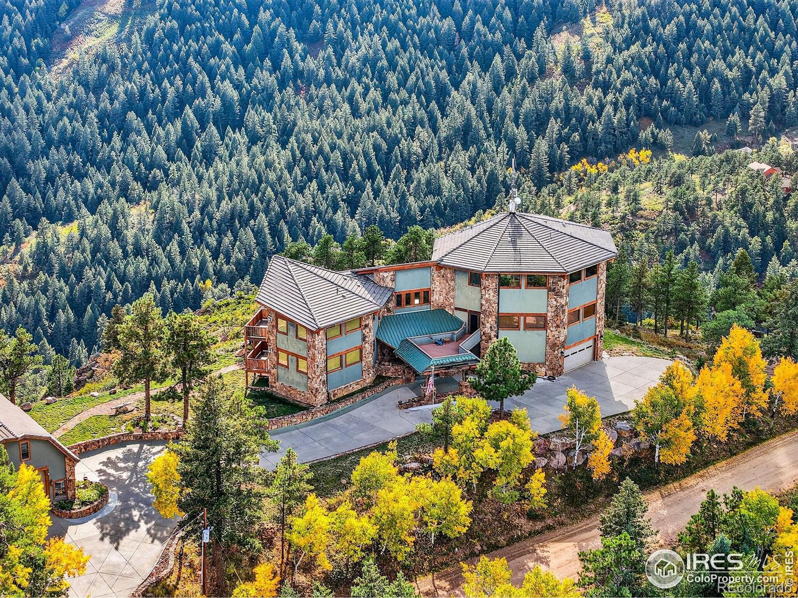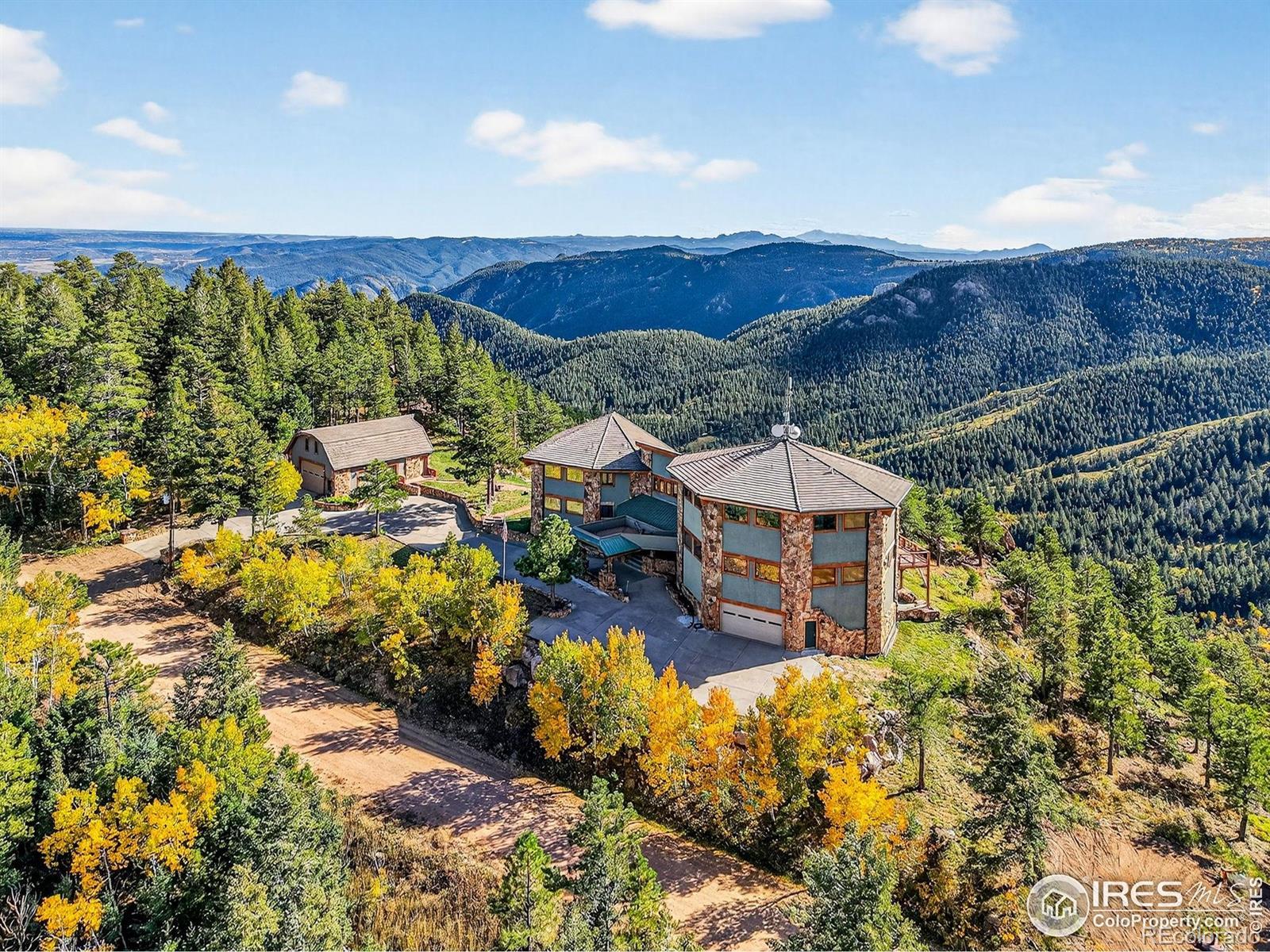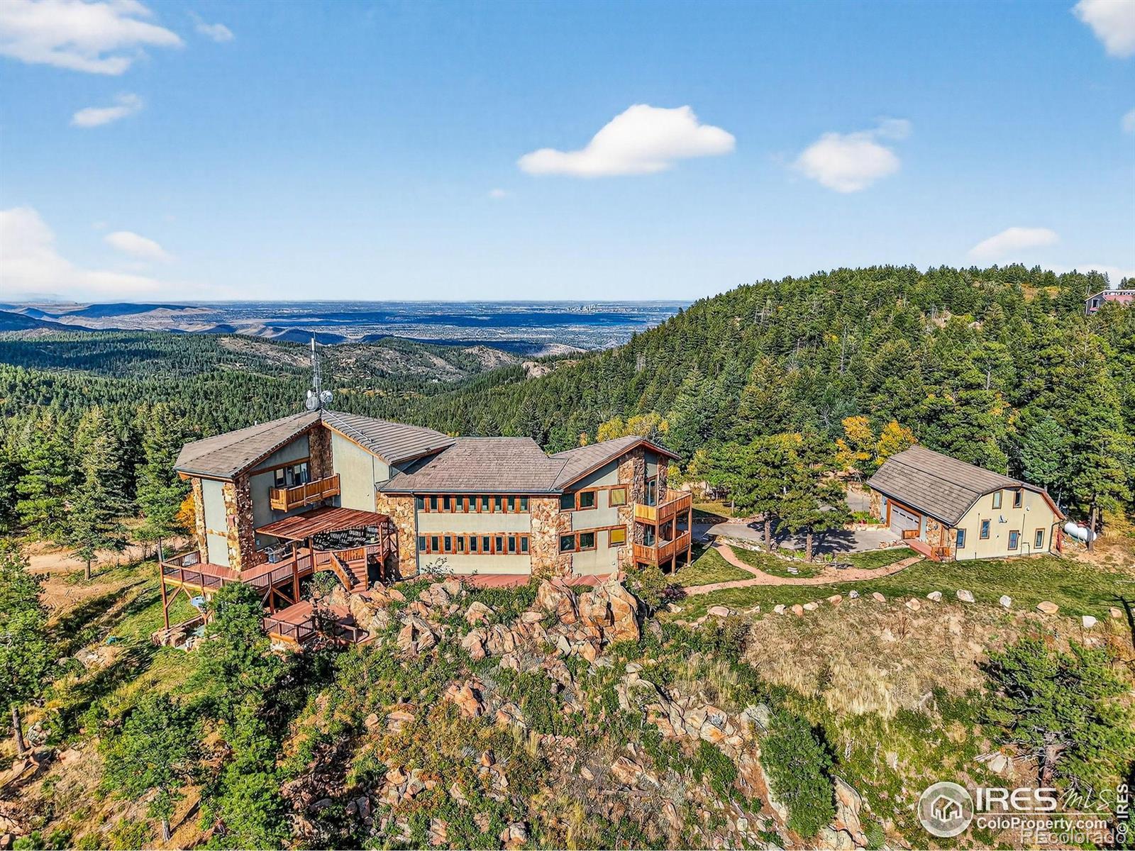 Perched atop the ridgelines of Deer Creek Canyon at over 8,000 feet in Littleton, CO, this custom estate at 14900 Elk Mountain Trail offers remarkable privacy, wide-open views, and relaxed Colorado mountain living. Set above forested valleys and rolling peaks, it blends classic mountain architecture with thoughtful craftsmanship throughout. Designed to maximize natural light and scenery, the home features expansive windows, vaulted beams, rich stonework, eastern white pine floors, and custom hickory cabinets, and picture windows on every level framing Pike's Peak, Mount Evans, Longs Peak, and the distant Denver skyline. The grand entry leads into a welcoming great room and well-appointed chef's kitchen with premium appliances, generous granite surfaces, dumbwaiter, and views in every direction. Warm finishes and a beautiful stone fireplace create an inviting, livable feel. Multiple primary suites with private balconies, plus additional bedroom retreats, ensure privacy and outdoor connection. Multiple decks make sunrise coffee, sunset dinners, and stargazing effortless. A separate oversized garage/workshop includes a full carriage home above-ideal for guests or multigenerational living. Propane generator and two owned 1,500-gallon tanks guarantee year-round reliability. Owners enjoy exclusive access to an adjoining 90-acre rural cluster and the property sits just 65 minutes from DIA-perfect as a full-time residence, mountain getaway, or family retreat with easy Front Range access. 14900 Elk Mountain Trail-your private mountaintop sanctuary.