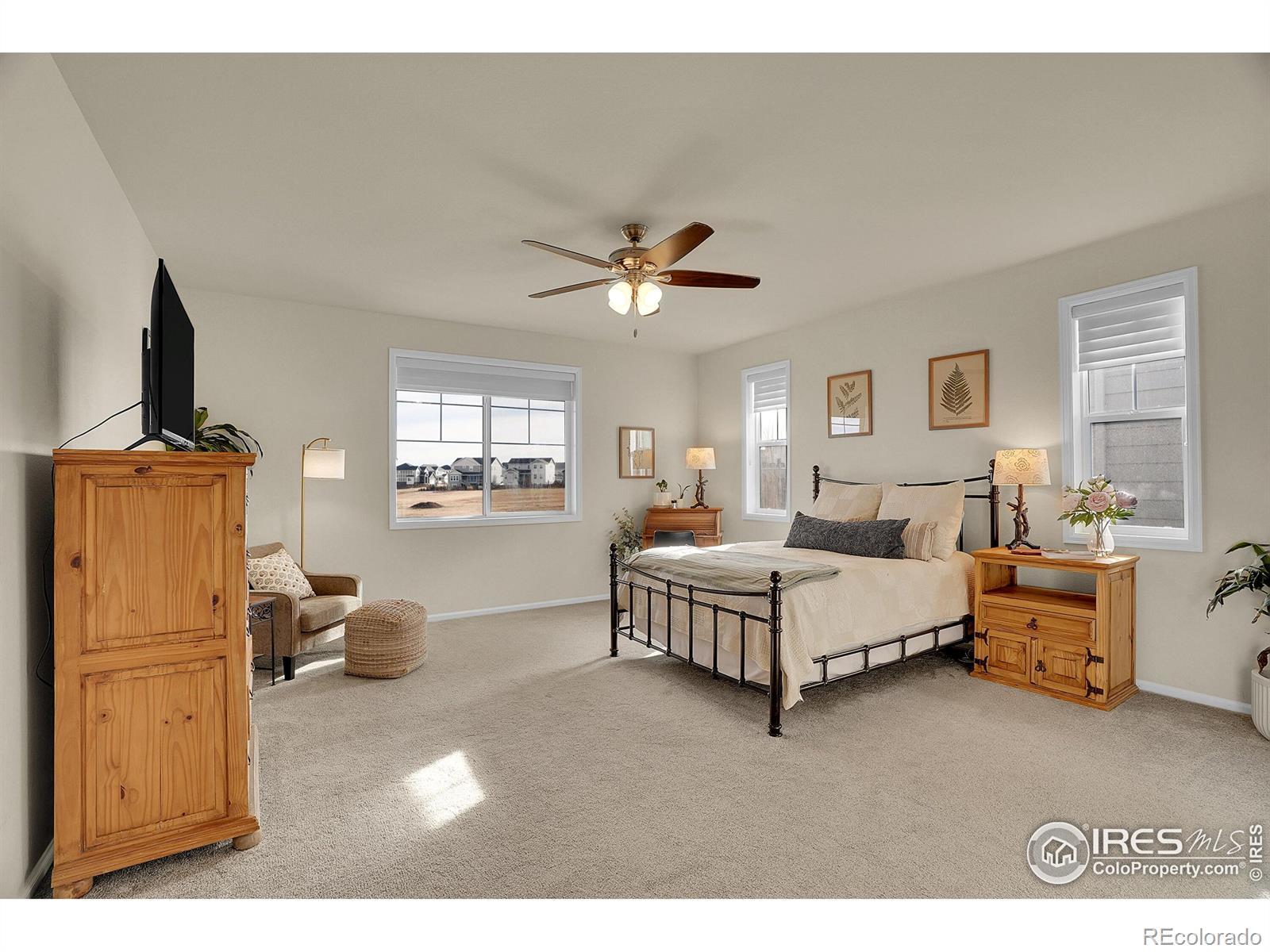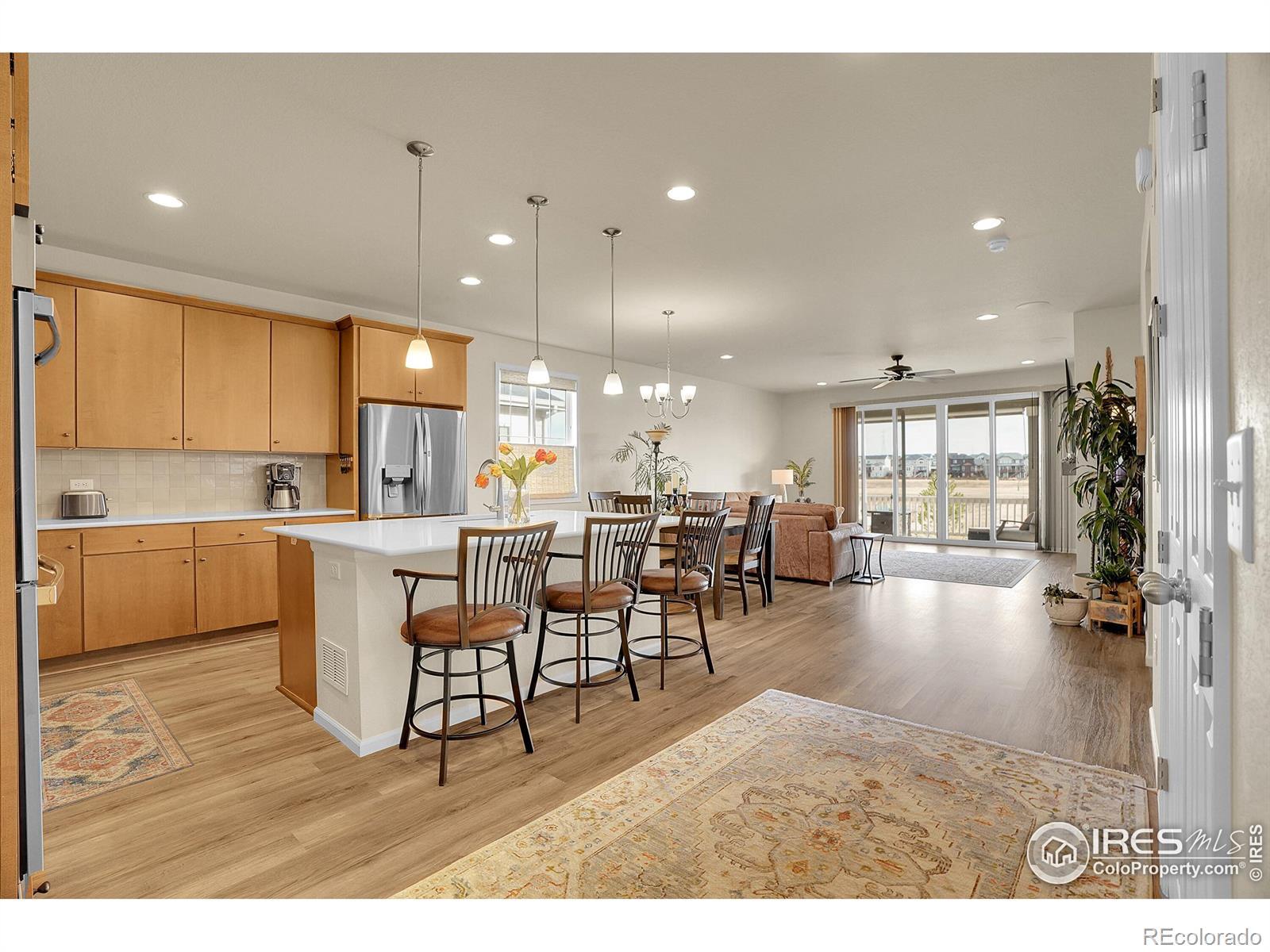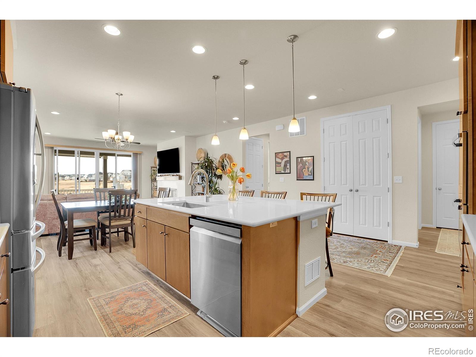 This stunning 5-bedroom, 3-bathroom ranch style home in Erie offers an unbeatable lifestyle. The expansive open floorplan flows seamlessly from the kitchen featuring sleek quartz countertops, high-end appliances including a sought-after double oven, into the cozy family room, perfect for everyday living and entertaining with surround sound installed. Step outside to the generous covered patio, which opens to open space and a walking trail, you can soak in breathtaking sunrises over the front range and watch colorful hot air balloons drift across the sky. It truly is an amazing sight. The spacious primary bedroom serves as a private retreat, while the finished basement will provide additional living space with its own surround sound set up and includes a wet bar offering flexibility for multiple entertainment areas. Additional highlights include and electric underground fence along with a heated garage. This is truly a must see! All information is deemed reliable, but is not guaranteed * Buyer & Buyer's Agent are responsible for verification of all information including, but not limited to information about HOA, schools, square footage etc.
