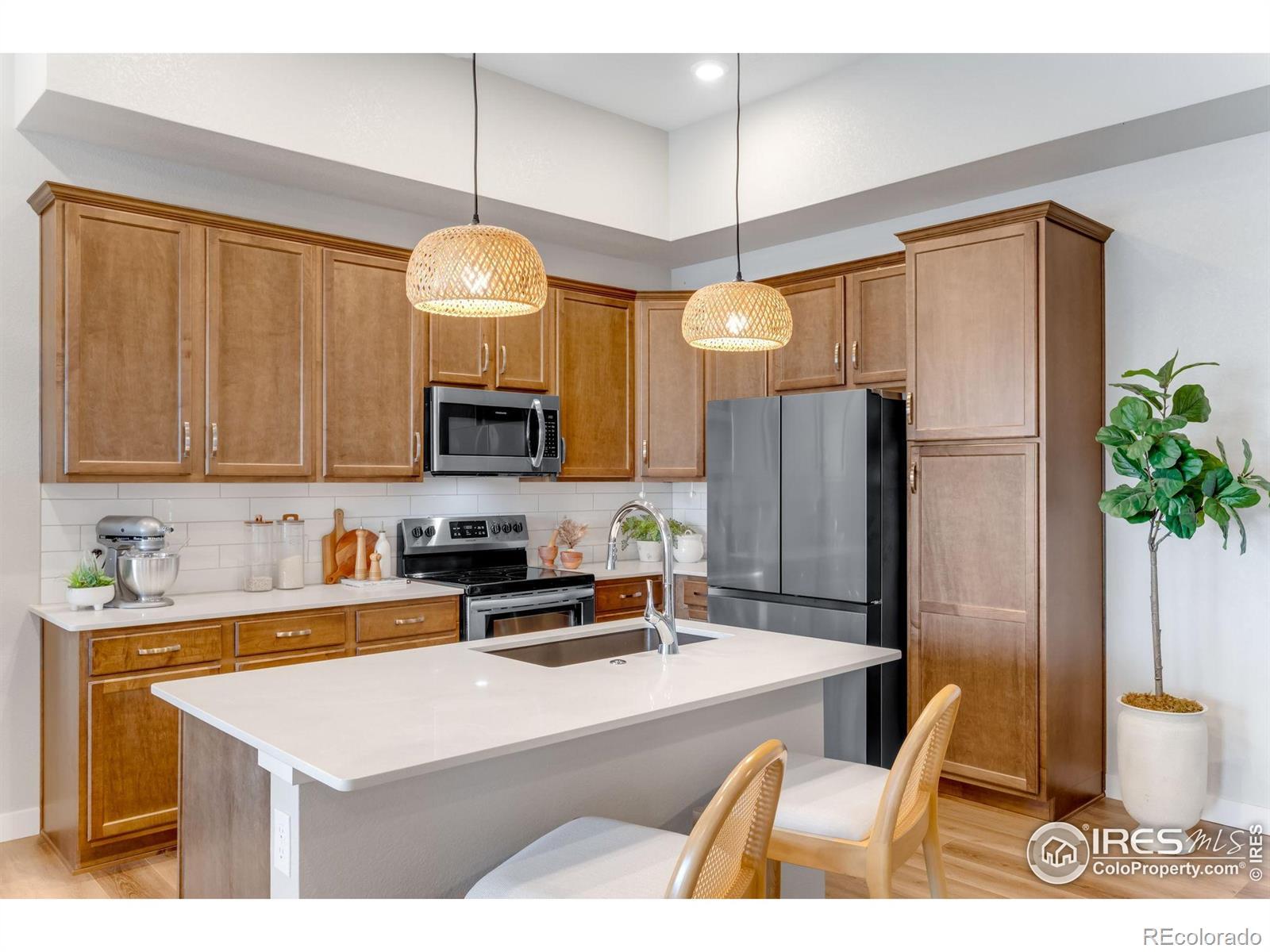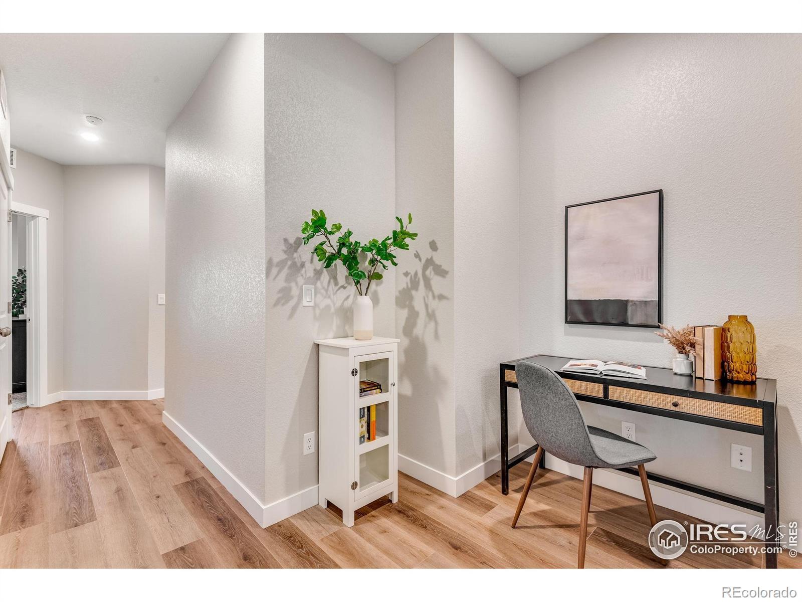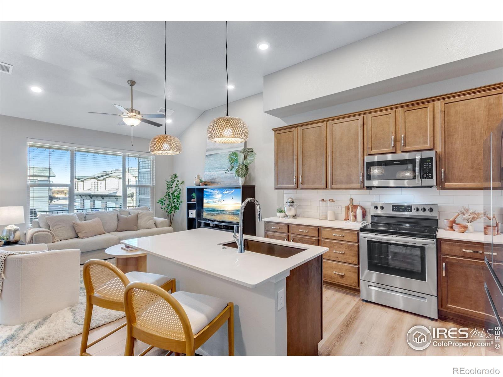 Move-in Ready, An exceptionally sunny corner end-residence, townhome-style condo in the coveted Lakes at Centerra, ideally positioned moments from I-25 and Highway 34 with effortless access to Centerra's premier amenities! Adorable Raised Ranch lightly lived-in & inviting open-concept layout. 1,653 finished SQFT with 1,535 SQFT on one level living, thoughtfully designed with 3 Bedrooms + versatile Office Nook area, 2 Bathrooms balancing comfort, function and style. The west-facing oversized single-car garage is fully insulated and sheet-rocked with an insulated door panel, perfect for Colorado seasons-while acres of HOA-protected open space to the south create a peaceful backdrop with immediate trail access. Inside - abundant storage off foyer and adjacent to the stairwell. The generous Primary suite serves as a private retreat with a walk-in closet & separate dual vanities in a spa-inspired primary bath with cool down seat in the shower. An expansive living room, covered front porch, and comfortable balcony enhance indoor-outdoor livability. Featuring a high efficiency furnace, tankless water heater & gorgeous designer finishes: quartz counters, full kitchen subway tile splash, maple cabinetry, stainless steel appliances and stainless appliances. Just down the street from the new park & Explorer's Club, miles of stunning trail access and along with access to Houts Reservoir & Equalizer Lake, close to the clubhouse, pool & community garden, play area, and High plains environment center. Minutes from all the Centerra shops/restaurants & Medical Center of the Rockies & the new Avenue South Centerra development/south side of 34 (HOA includes internet too/Pulse High Speed Fiber.) Easy guest parking to the north.