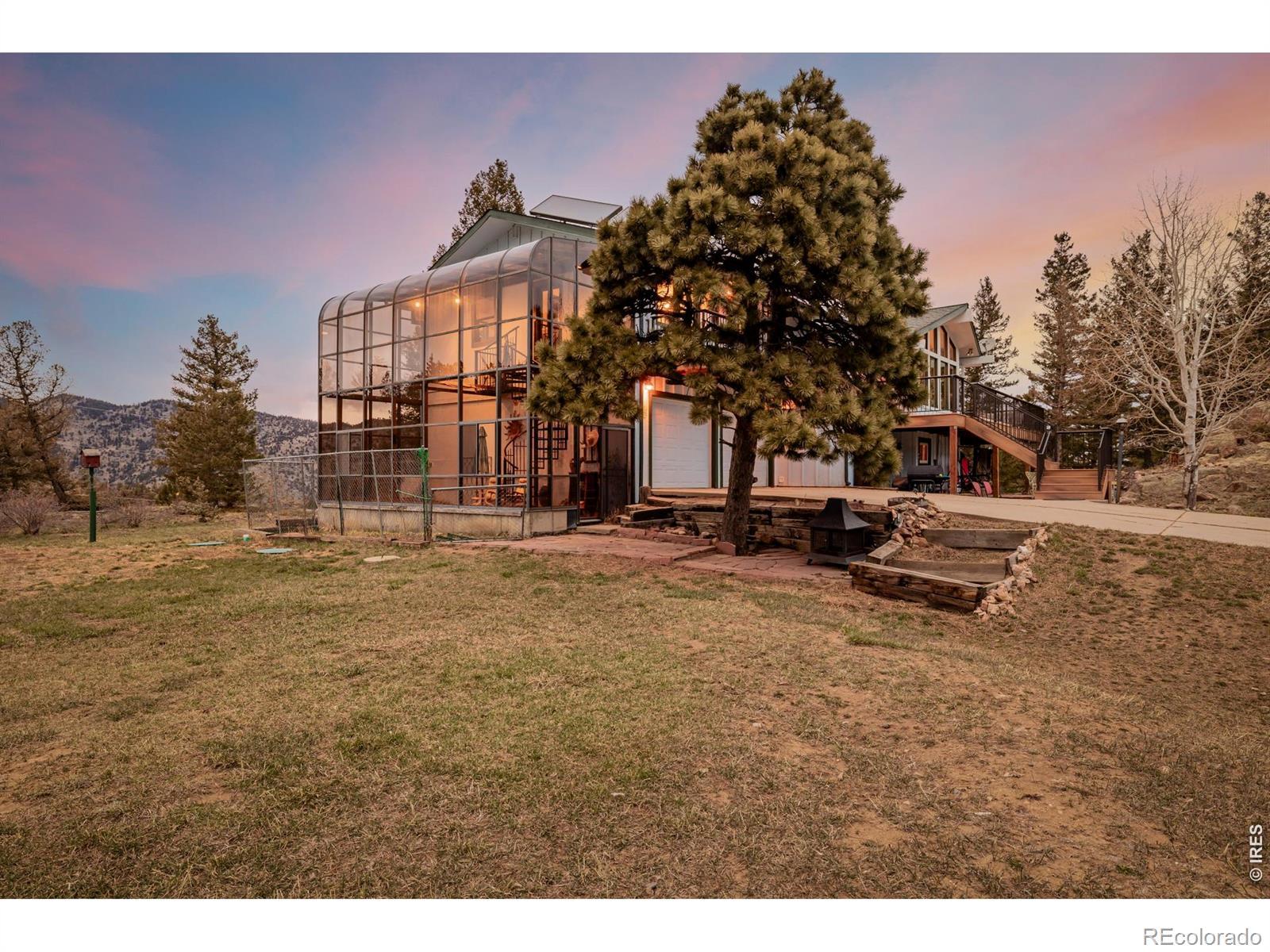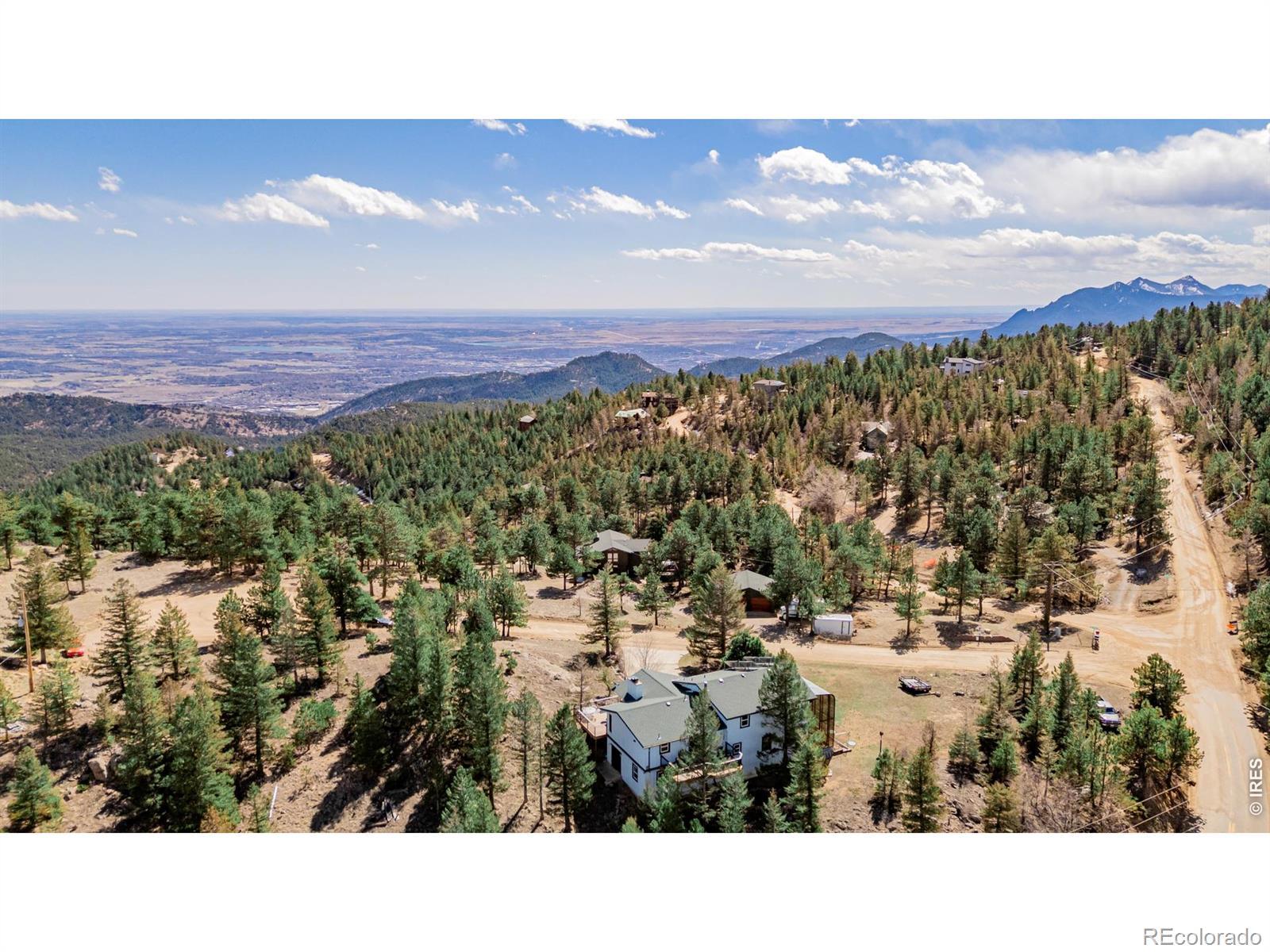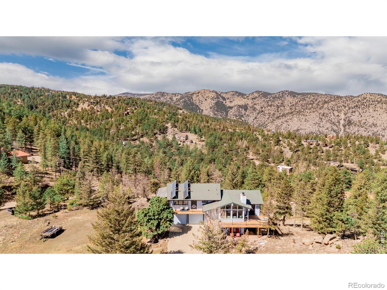 What a RARE find! Situated on a corner gently sloping 1.47-acre lot of a cul-de-sac, this beautiful property offers unparalleled privacy, tranquility, and panoramic views of the Foothills & the sparkling lights of Boulder Valley. Offering 4 bedrooms, 3 bathrooms, and an oversized 2-car garage w/extended driveway. The interior beautifully embraces a rustic contemporary style, blending natural materials like wood and stone with modern design elements to create a warm & inviting atmosphere! Enhanced by abundant natural light, vaulted ceilings, exposed beams, a designer palette, and wood-look flooring w/plush carpet in all the right places. Discover the separate dining room and the welcoming living room with a fireplace! The kitchen boasts solid-surface counters, a subway tile backsplash, ample wood cabinetry, and a peninsula w/breakfast bar. You'll LOVE the main bedroom with a full bathroom! It also includes access to the attached solarium/greenhouse, where you can watch the snow fall in warmth and comfort. But that's not all-the large walk-out basement will impress! It features an inviting family room, an additional fireplace, a bathroom, 4th bedroom, and sliding doors that merge the inside/outside activities. Imagine sipping your favorite beverage while enjoying the breathtaking mountain vistas right from your multiple decks! This residence is surrounded by towering pine trees and scenic rock outcroppings, creating a tranquil retreat to unwind, watch wildlife, and soak in the beauty of nature. Located on a county-maintained and plowed road, this home offers year-round accessibility. PLUS! Just minutes from downtown Boulder's shops, restaurants, hiking trails, and top-rated schools, this home blends serene mountain living with easy city access. Don't miss this opportunity to own a piece of Boulder's coveted mountain community!