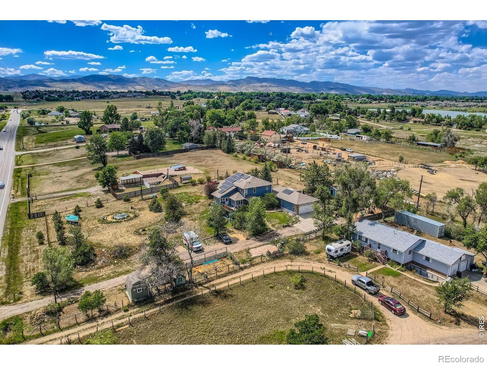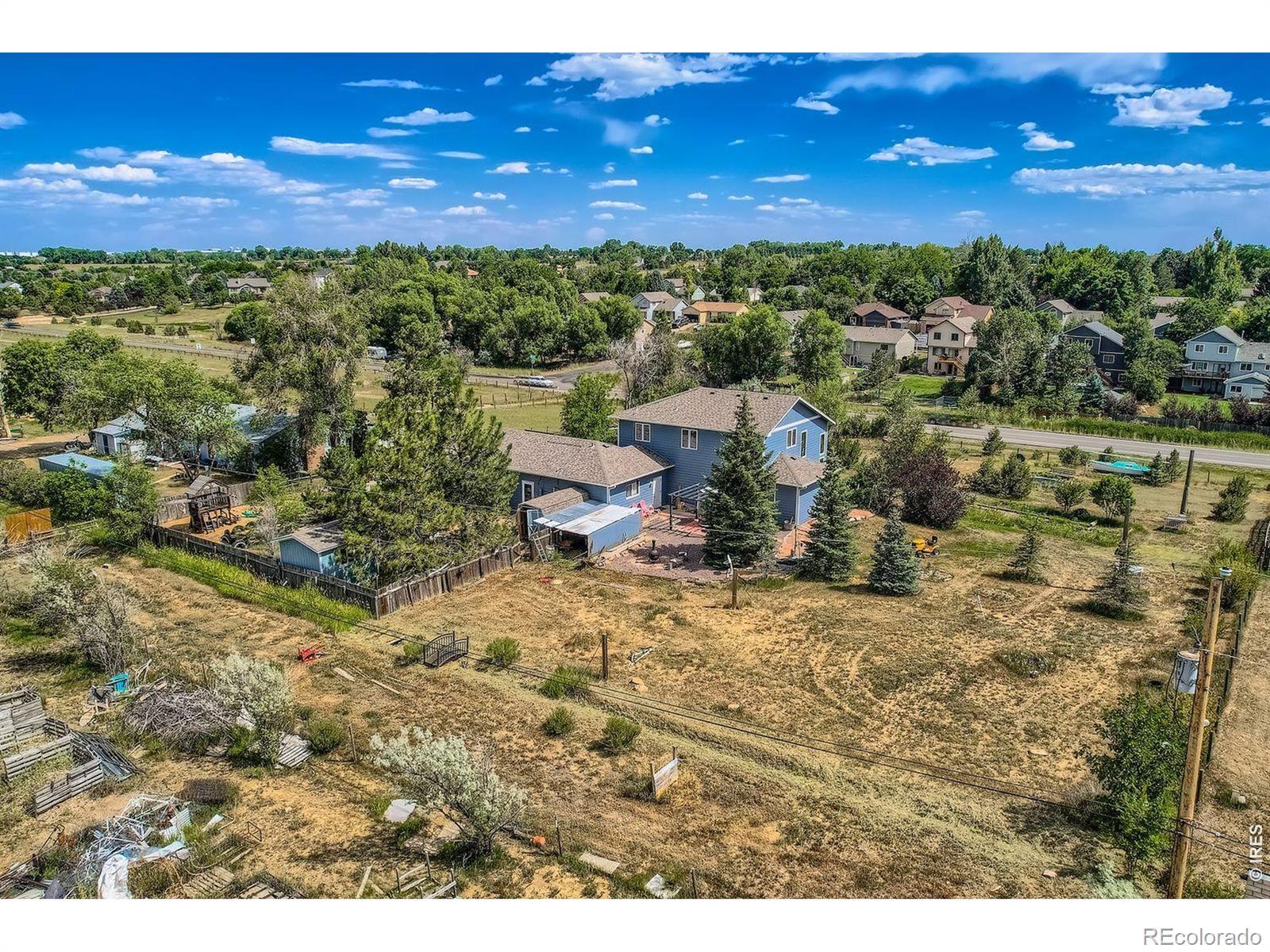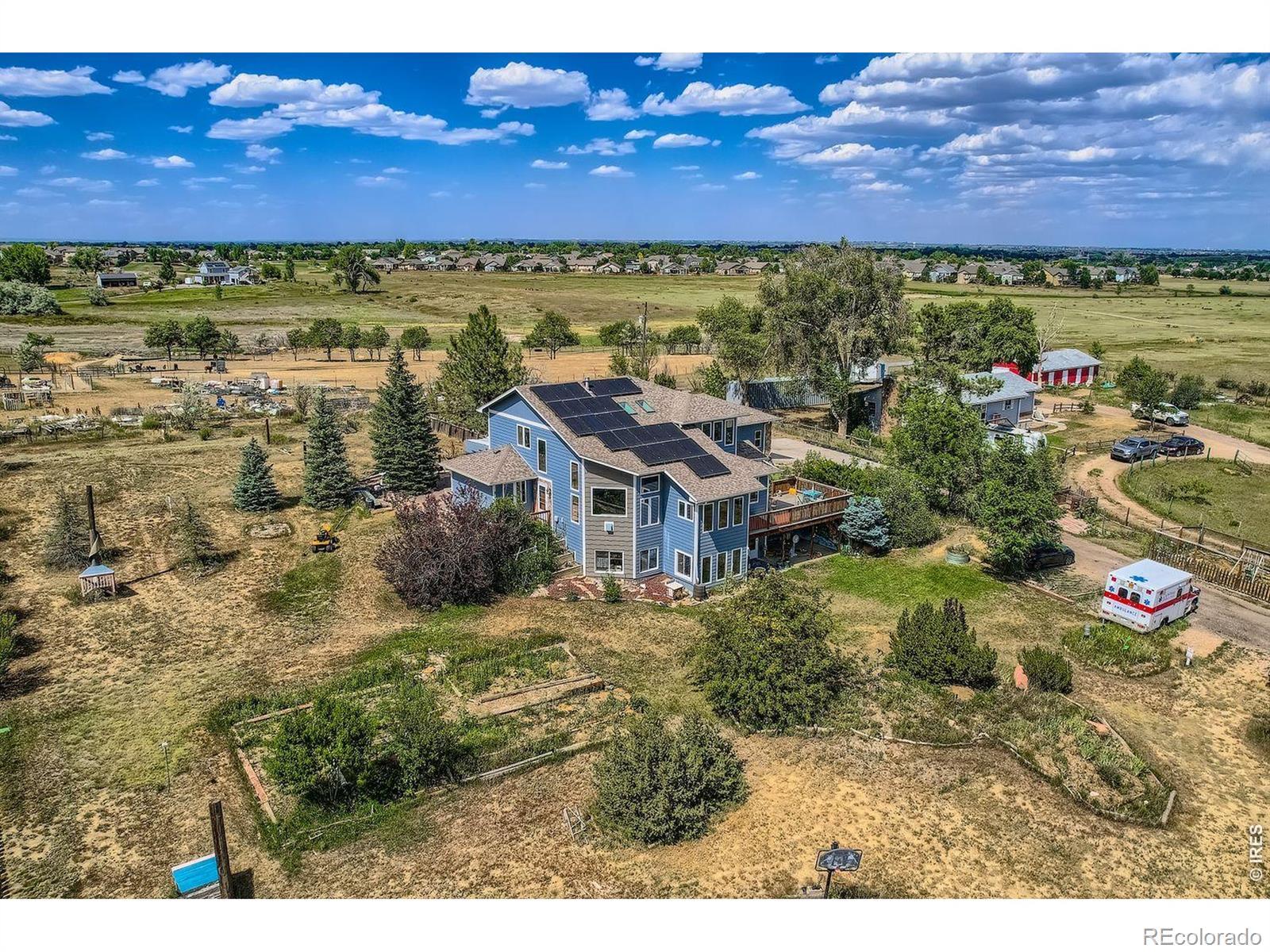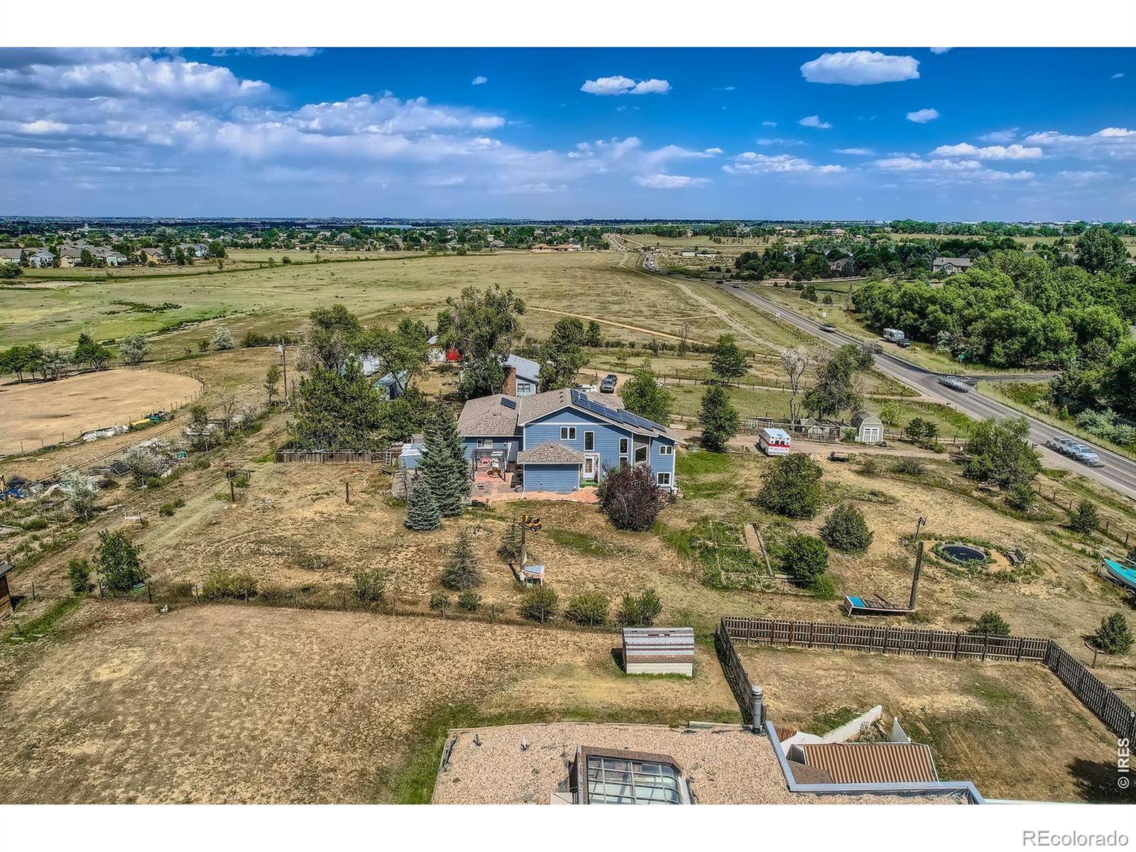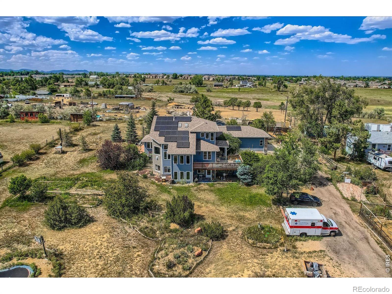 Enjoy true Colorado living on 1.5 acres with stunning Front Range views, no HOA, no Metro District, and rare FA1 zoning-bring your horses, goats, and chickens. Located just 5 minutes from I-25, this property offers peaceful country space with easy access to everything.This versatile 5-bedroom, 3-bath home is ideal for multi-generational living, featuring a fully finished walk-out basement with private entrance, full kitchen, family room, two bedrooms, and a 3/4 bath-perfect for extended family or rental potential.The light-filled great room showcases soaring ceilings, expansive windows framing the mountains, and a gas fireplace. The updated kitchen features quartz countertops, farmhouse sink, wall ovens, gas cooktop island, and two-tone cabinetry. A main-level bedroom and full bath add flexibility, while upstairs offers two bedrooms, a loft, and another full bath.Enjoy sunsets from the spacious upper deck or relax on the shaded patio below. Additional highlights include owned solar, newer roof and HVAC, oversized garage, RV parking, and mature landscaping.A rare blend of acreage, views, and flexibility-ready for modern Colorado living.