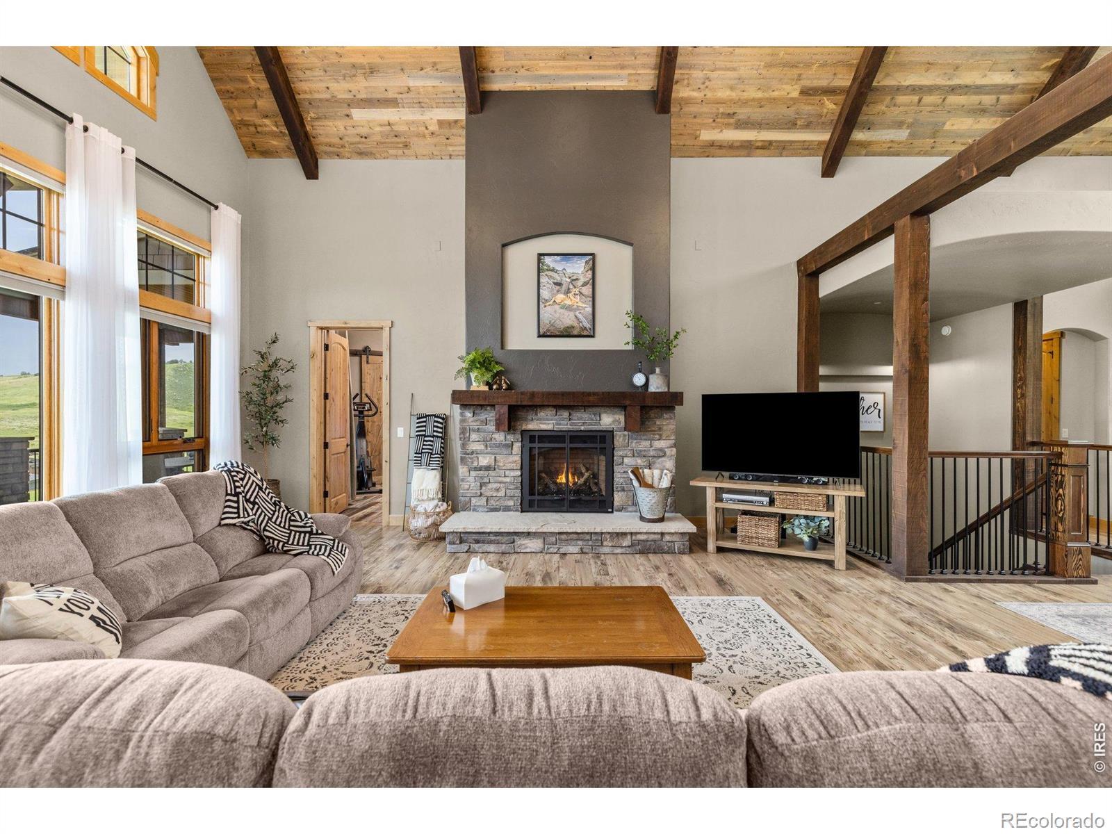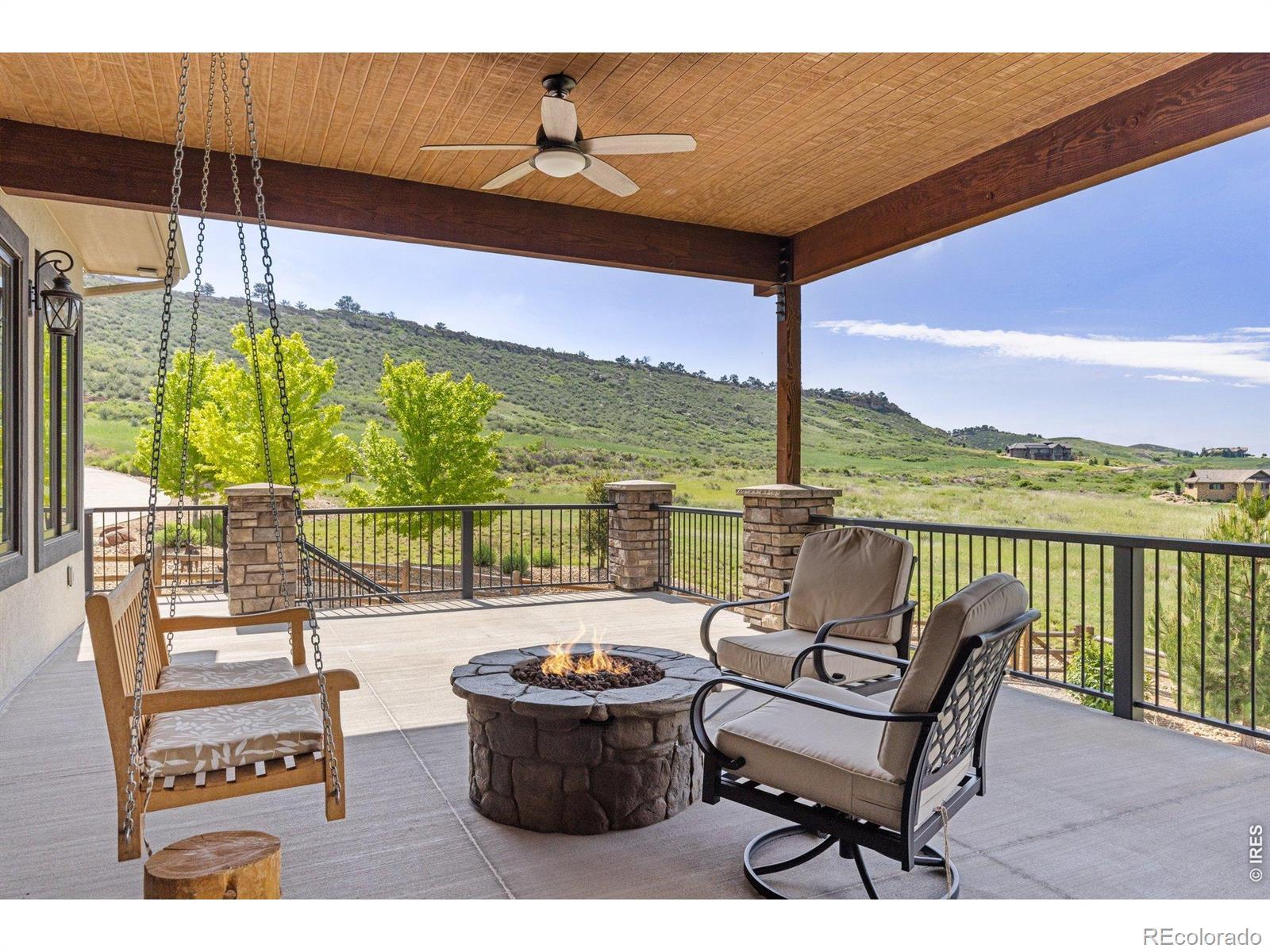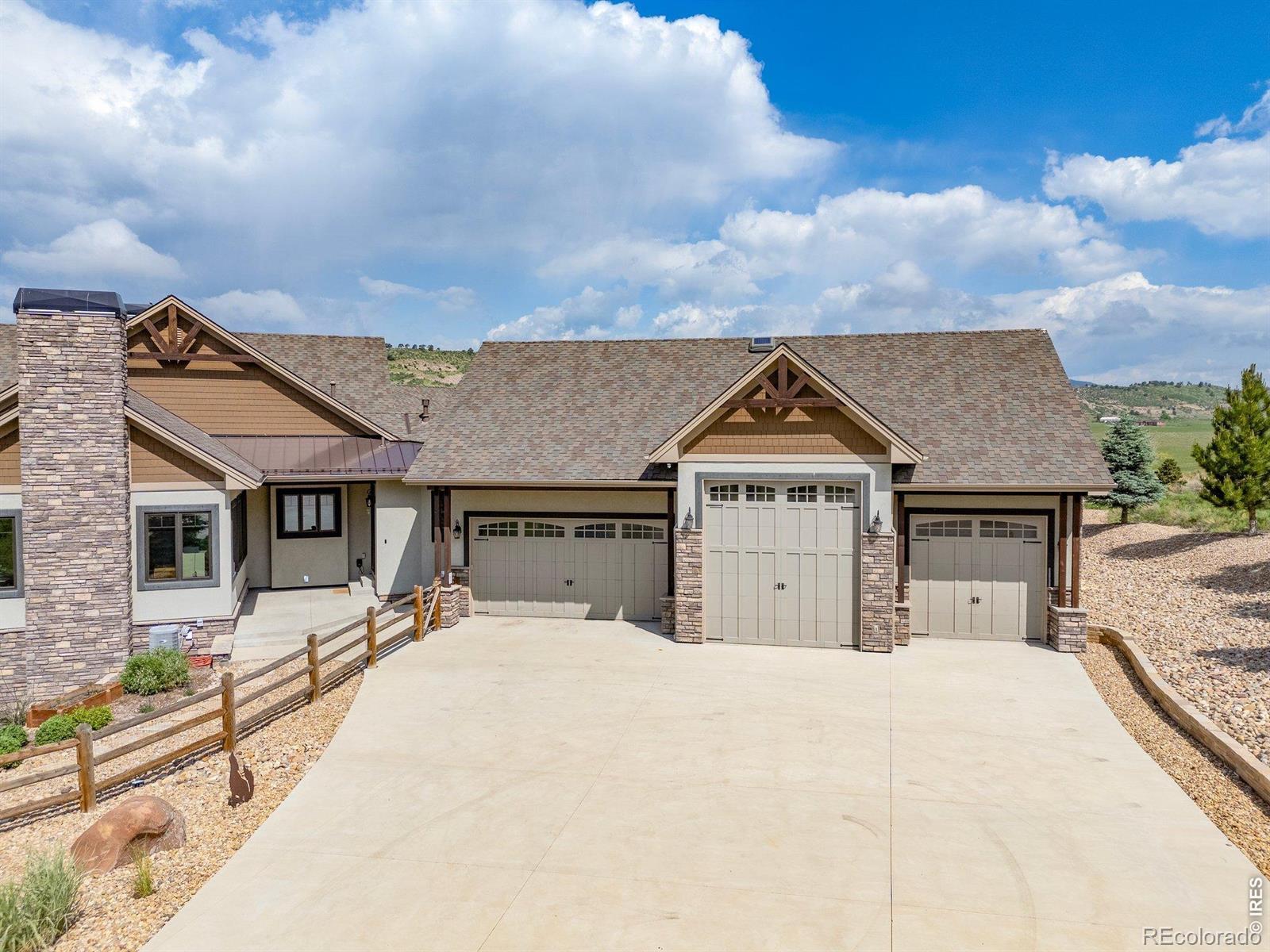 Nestled in the coveted Hidden Valley Estates gated community, this custom-built home offers unparalleled beauty and serenity. Located near the Devil's Backbone hiking area just West of Loveland, this property boasts panoramic views of Mount Meeker, Longs Peak Mountain along with the Devil's Backbone, perfect for nature lovers and outdoor enthusiasts. This estate was constructed with state-of-the-art products and exemplifies incomparable quality of workmanship and materials. Thoughtful & convenient high-tech devices are throughout the home, garage, & exterior and make operation of the property seemingly effortless. This home features a soaring 23-foot ceiling in the great room adorned with Wyoming snow fence accents and rough-sawn beams, creating a grand and inviting atmosphere. Walls of windows and patio doors bring the outdoors to life in virtually every room of the home. Located on the main floor, the large primary suite offers ultimate comfort with a luxurious 5-piece bath, a two-person jetted and heated tub, dual vanities, a private water closet, and a spacious walk-in closet. Also on the main level, a spacious office features a fireplace, vaulted ceilings and beams. The finished walkout basement includes 3 bedrooms, 2 bathrooms, a FULL kitchen, and an entertainment area with a fireplace. The unfinished area has been thoughtfully prepped for a future large theater room. Car enthusiasts and hobbyists will LOVE the 3809 sq. ft. garages with room for up to TEN cars plus an RV. One garage functions as a workshop with heating, A/C, bathroom and epoxy flooring, while the other is also heated to ensure year-round comfort. Whether you are sipping coffee on the expansive deck, spotting wildlife, watching your dogs play in the fully fenced and professionally landscaped yard, or entertaining family and friends, this one-of-a-kind mountain view retreat offers luxury living in a peaceful, scenic setting. This home is the answer to the Colorado lifestyle of your dreams.