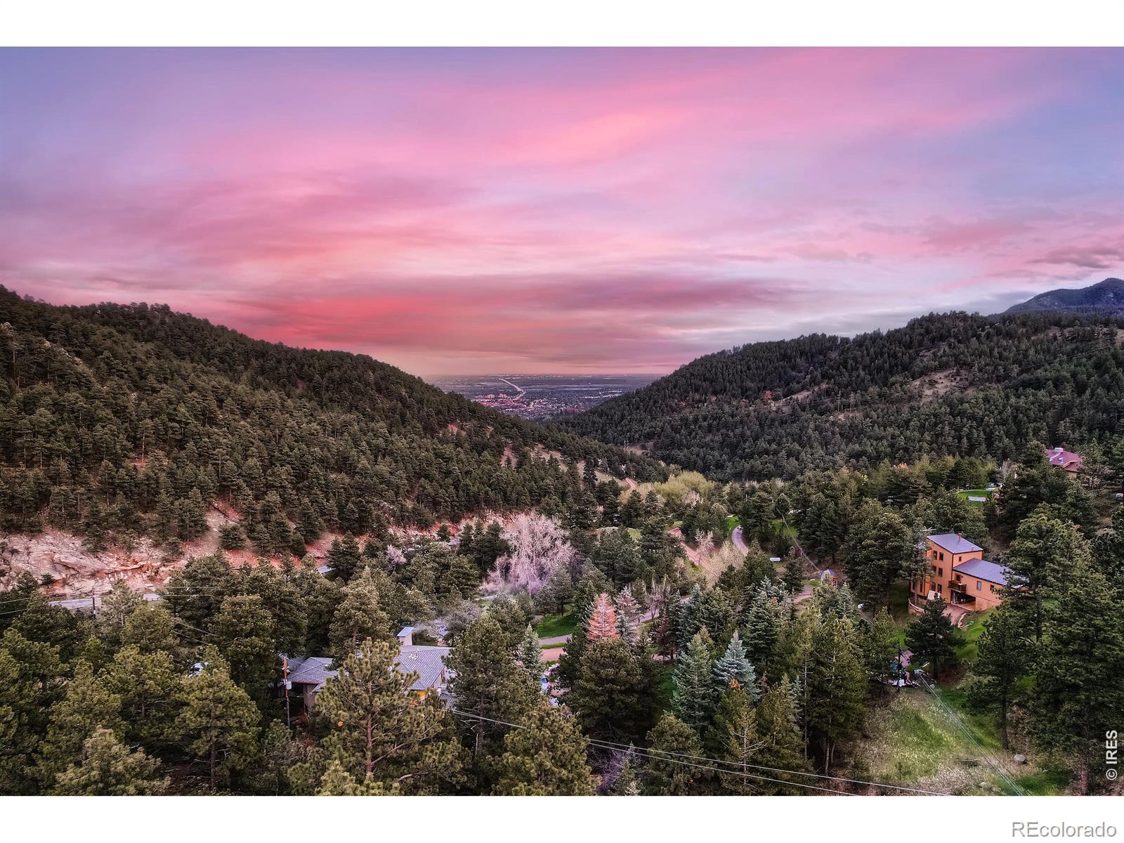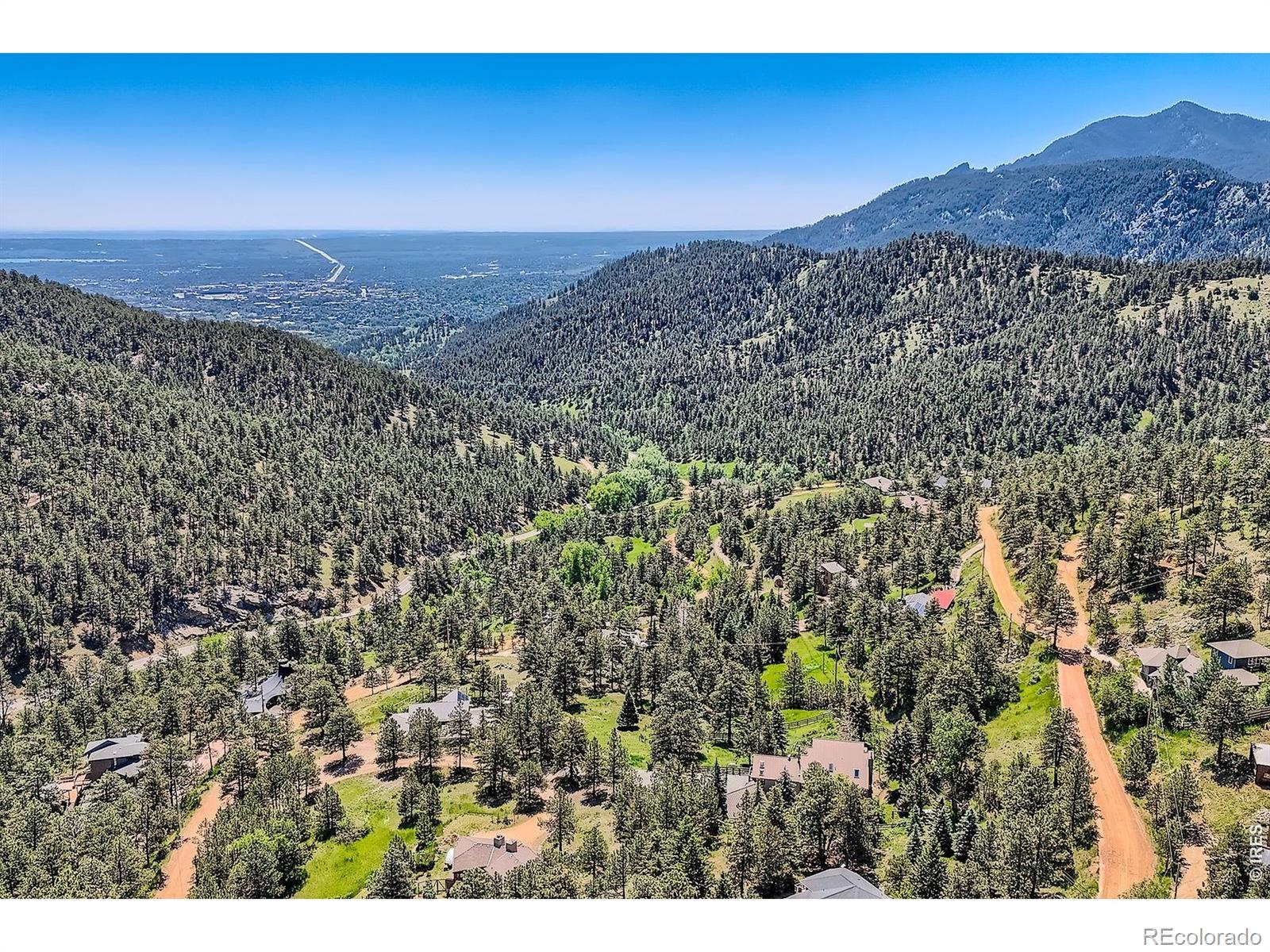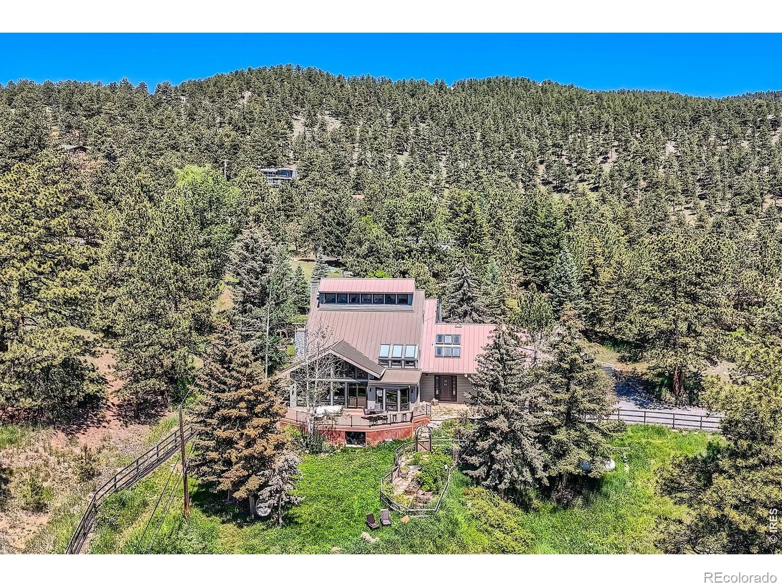 Beautifully renovated Sunshine Valley home, perfectly positioned on nearly two private acres just moments from Pearl Street Mall. Where elevated mountain living meets refined design: an exceptional five-bedroom home with a versatile bonus space, framed by sweeping views of Boulder and the plains below. Soaring, beamed ceilings and dramatic floor-to-ceiling windows anchor the great room, inviting natural light to pour in while capturing breathtaking vistas in every season. Rich wood and stone textures create a warm, alpine sophistication, blending timeless craftsmanship with an elevated aesthetic. The formal dining room, illuminated by a statement chandelier, sets the stage for unforgettable evenings against a backdrop of mountain skies. The eat-in kitchen is both functional and beautifully appointed, featuring a generous prep island, breakfast bar, and sunlit breakfast nook for effortless mornings and lively gatherings. A charming main-level bedroom with a wood-burning stove offers comfort and flexibility, ideal for guests or a private study. Ascend the handcrafted log staircase to a secluded upper-level retreat. The primary suite unfolds through a light-filled flex space, perfect for an office or wellness room, into serene sleeping quarters with dual closets, a wood-burning fireplace, and a Juliette balcony with stained glass overlooking a tranquil, tree-lined setting. The five-piece bath delivers spa-level indulgence with an oversized shower and soaking tub. Additional upper-level bedrooms include one with private deck access to the backyard sanctuary, while the top level offers a fifth bedroom plus a non-conforming sixth, ideal for guest quarters, creative space, or a studio. Outdoors, a fenced yard and flourishinggarden complement the natural landscape, creating a setting that feels both expansive and intimate. Just minutes from downtown Boulder's vibrant downtown, this rare offering delivers privacy, scale, and proximity-an extraordinary mountain estate.
