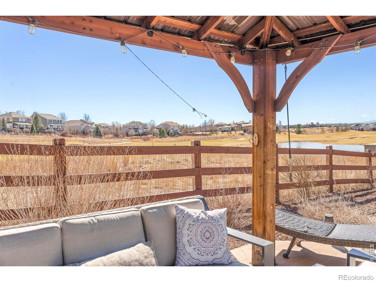 Tucked on a private cul-de-sac, this elegant home offers quiet luxury and exceptional privacy along the 17th hole of the Colorado National golf course. Perfectly positioned to capture the golf course and mountain views without the worry of stray golf balls, the course behind the property provides a serene and private backdrop with sweeping fairway and mountain vistas. An open and airy floorplan is highlighted by a large kitchen showcasing stainless steel appliances, granite stone countertops and a full tile backsplash. The spacious primary suite is a true retreat, featuring a cozy fireplace, private sitting area, and generous his-and-hers walk-in closets with custom built in closet systems. A quiet, cooling attic fan allows you to take full advantage of Colorado's refreshing evening air, complemented by a whole-house humidifier for year-round comfort. Whether entertaining in the inviting outdoor living space overlooking the greens or enjoying a quiet, relaxing evening in the hot tub, this home offers the perfect balance of luxury, privacy, and Colorado beauty. Kick off your shoes with the Custom built-in cubbies adjacent to the oversized three-car garage provide ample storage. Custom lighting throughout, two fireplaces, a charming front porch swing and a pergola complete this welcoming haven.