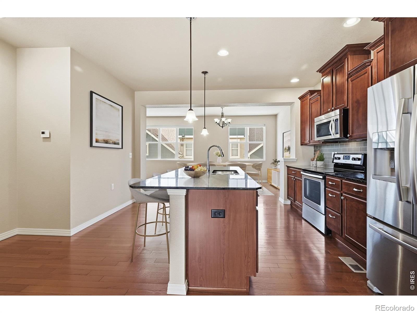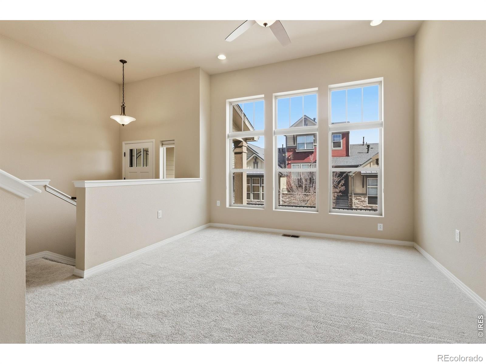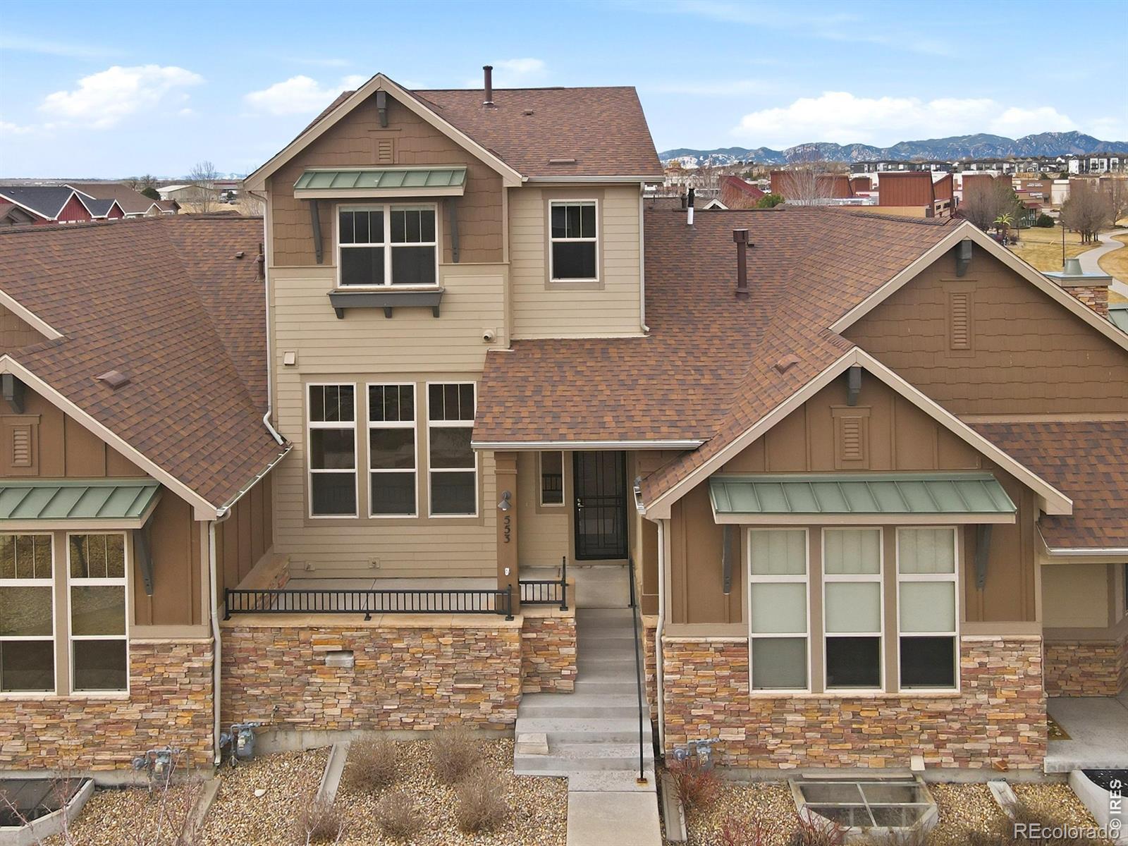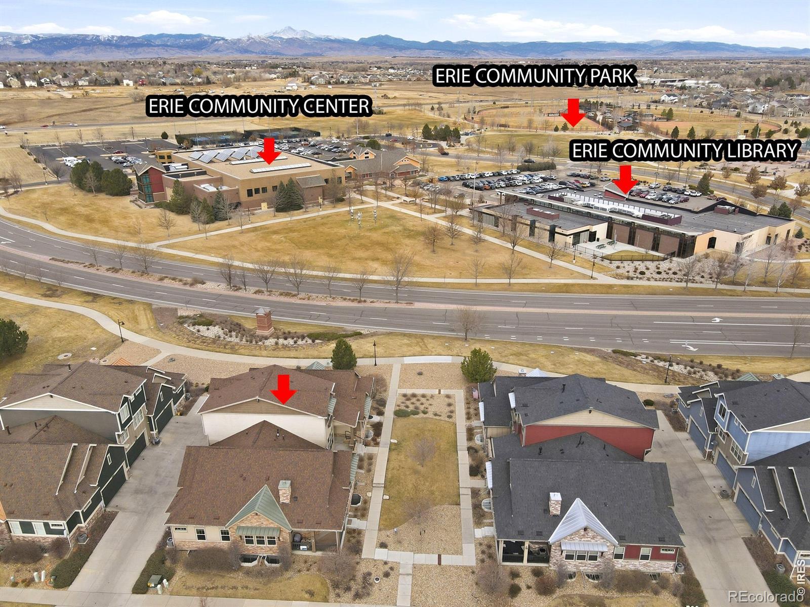 Incredible location where you can walk to everything in the heart of Erie! Located in the highly desirable Erie Commons community, this townhome is a 2 min walk to the Erie Rec Center & Library, Rusty Melon, Pho-Ever, Ziggi's Coffee, Starbucks, Aspen Ridge Preparatory School and only a 5 min walk to the Coal Creek trail open space and 5 min bike ride to Erie's single track. Gorgeous townhome with soaring ceilings, hardwood floors and an abundance of windows. Wide open floor plan where the kitchen is the center of this special home which connects both the dining & family rooms seamlessly - ideal for both everyday living or hosting parties & holiday events. The beautiful kitchen boasts granite countertops, subway tile backsplash, SS appliances and a huge island with seating for 4. Family room overlooks the front greenspace and has a gas fireplace. Dining room is big enough for a full-sized dining table and bonus sitting area. Upstairs is the spacious master suite with walk-in closet and en-suite 4pc bath. 2 additional bedroom share a full bath on the upper level and a small loft area perfect for an open office or tv area. All this plus there is nearly 300 SQ FT of conditioned basement storage space accessed through the oversized 2-car garage. True maintenance free living where the HOA covers all exterior maintenance, all landscaping, trash, water, sewer, hazard insurance & also a great community pool & park only 2 blocks away. New roof (2023) New exterior paint (2022), on-demand hot water heater, fresh furnace clean & cert, upper floor laundry, basement storage area, 2 car attached garage, premiere location, all appliances included - nothing to do but move in! All this plus Old Town Erie is only 1 mile away with all the shops, restaurants, stores, Coal Creek Park, Erie Ice Skating Rink and Maddie's Park. *** Showings Start Saturday, March 14th ***
