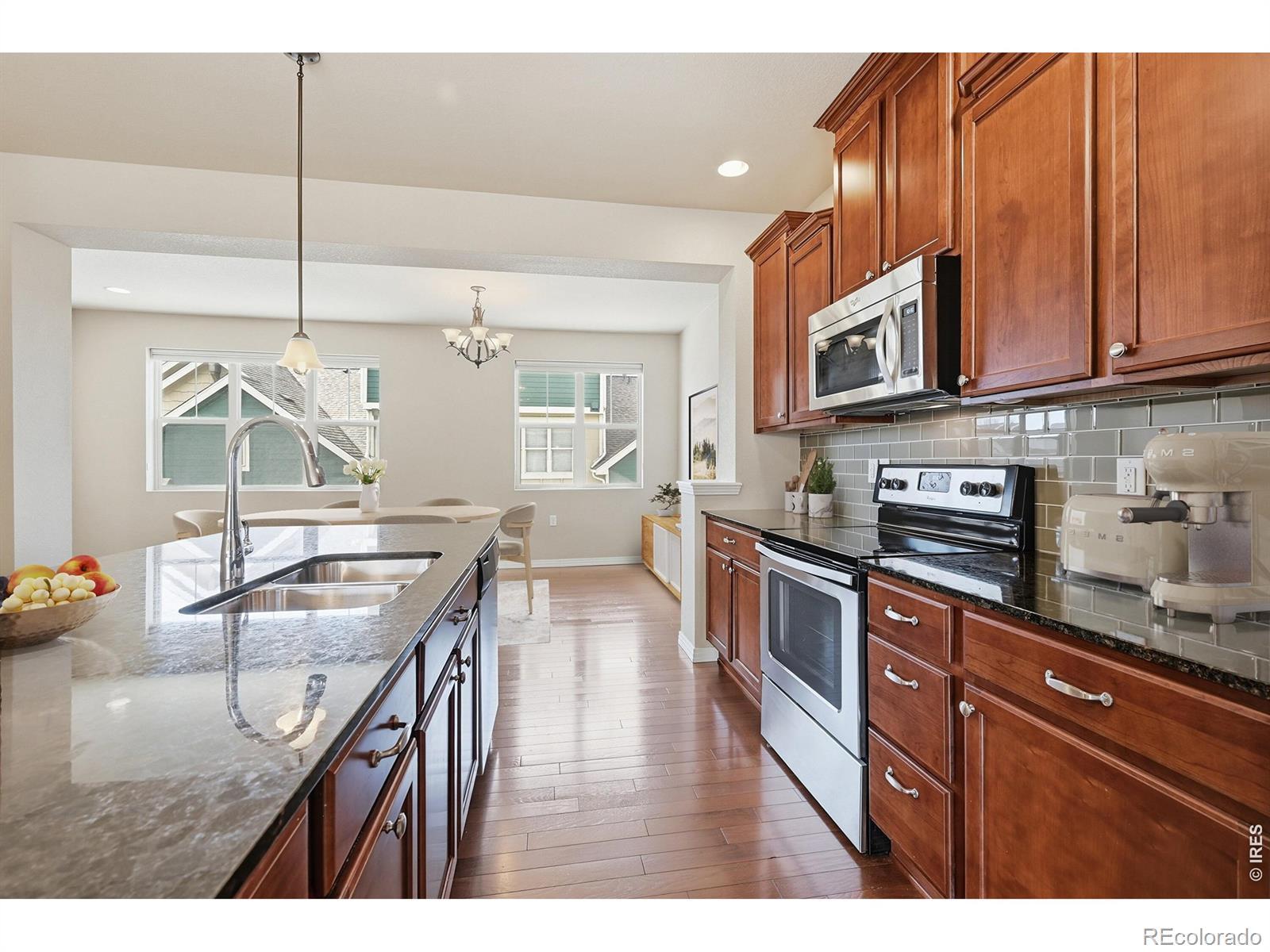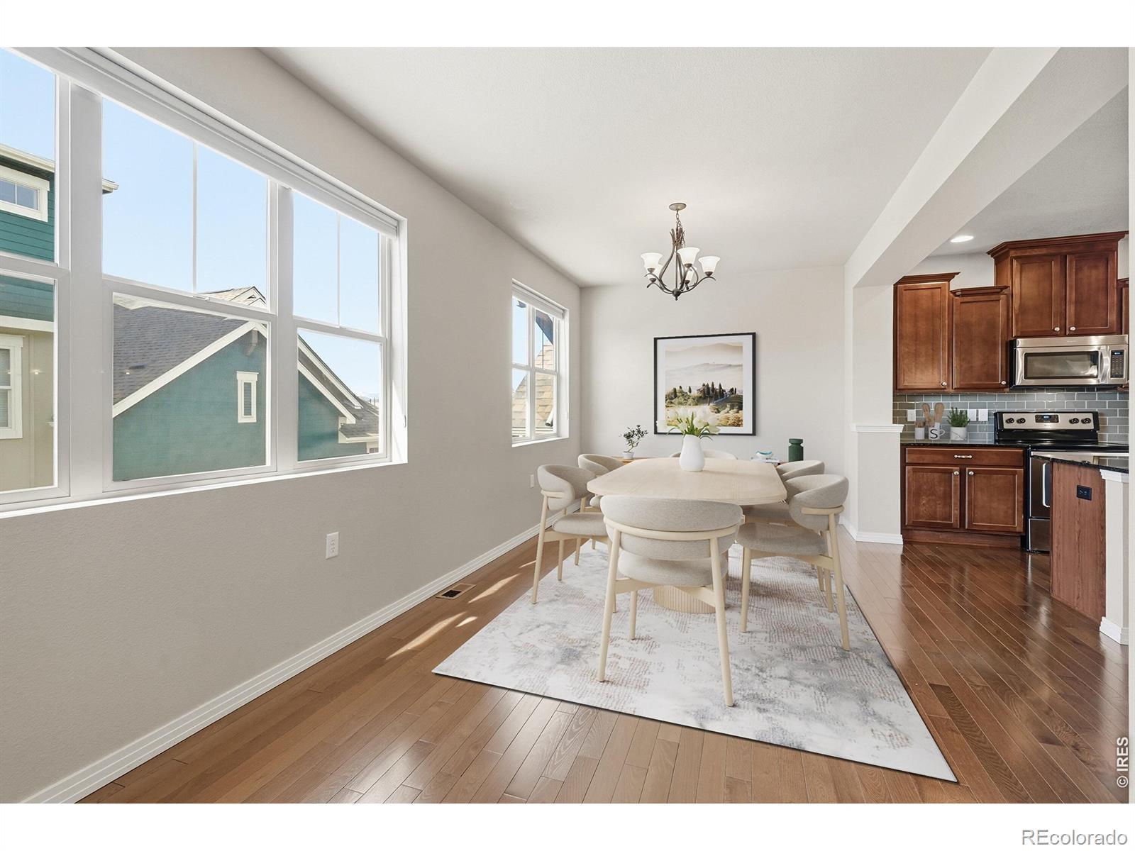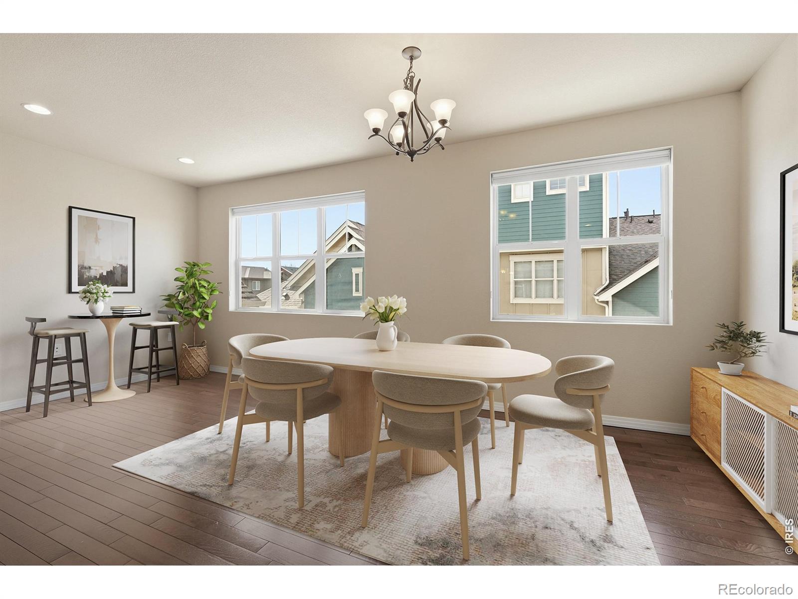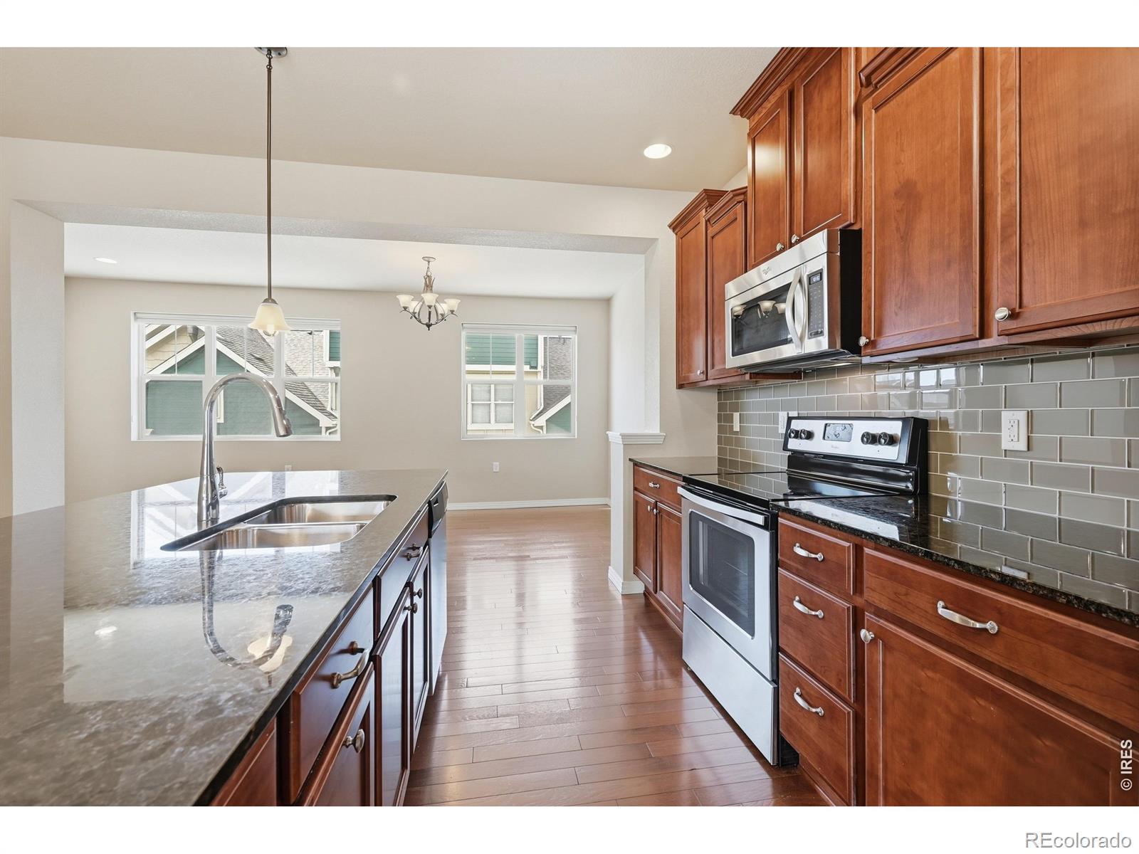 Incredible location where you can walk to everything in the heart of Erie! Located in the highly desirable Erie Commons community, this townhome is a 2 min walk to the Erie Rec Center & Library, Rusty Melon, Pho-Ever, Ziggi's Coffee, Starbucks, Aspen Ridge Preparatory School and only a 5 min walk to the Coal Creek trail open space and 5 min bike ride to Erie's single track. Gorgeous townhome with soaring ceilings, hardwood floors and an abundance of windows. Wide open floor plan where the kitchen is the center of this special home which connects both the dining & family rooms seamlessly - ideal for both everyday living or hosting parties & holiday events. The beautiful kitchen boasts granite countertops, subway tile backsplash, SS appliances and a huge island with seating for 4. Family room overlooks the front greenspace and has a gas fireplace. Dining room is big enough for a full-sized dining table and bonus sitting area. Upstairs is the spacious master suite with walk-in closet and en-suite 4pc bath. 2 additional bedroom share a full bath on the upper level and a small loft area perfect for an open office or tv area. All this plus there is nearly 300 SQ FT of conditioned basement storage space accessed through the oversized 2-car garage. True maintenance free living where the HOA covers all exterior maintenance, all landscaping, trash, water, sewer, hazard insurance & also a great community pool & park only 2 blocks away. New roof (2023) New exterior paint (2022), on-demand hot water heater, fresh furnace clean & cert, upper floor laundry, basement storage area, 2 car attached garage, premiere location, all appliances included - nothing to do but move in! All this plus Old Town Erie is only 1 mile away with all the shops, restaurants, stores, Coal Creek Park, Erie Ice Skating Rink and Maddie's Park. *** Showings Start Saturday, March 14th ***